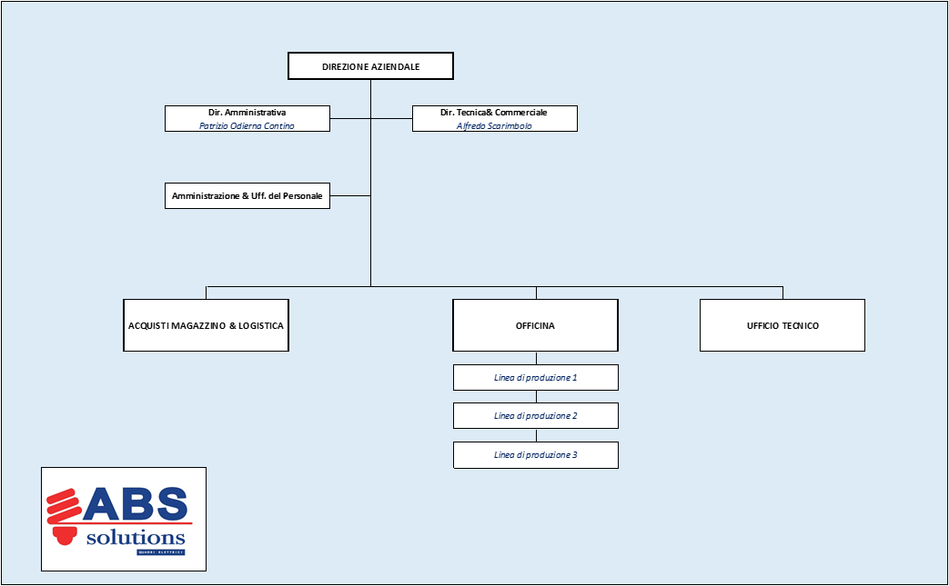 La struttura organizzativa di ABS Solutions Quadri Elettrici è snella ed essenziale, ciò consente celerità del flusso comunicativo ed operativo, riducendo al minimo le richieste di autorizzazione a procedere tra i diversi uffici. Il sistema di gestione ed archiviazione dati è centralizzato a livello server e fruibile anche dal personale operante in trasferta o fuori sede.